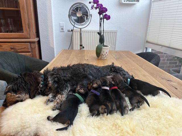 Angeboten: Deutsch Langhaar "vom Runenpark" erwartet A. August Welpen aus >Quilla v. Schatzrain< 471/14A, ds,62cm, v/sg/v, Btr.,SWI/III,J66sil, H180,G259/3 ÜF, lt nach